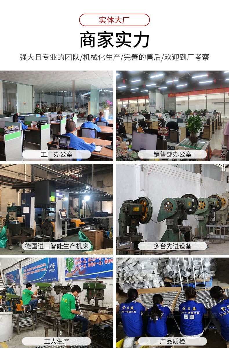 公司設立:裁切車間,焊接車間,零配件生產車間,組裝車間,為建筑工程商,提供一站式 不銹鋼護欄以及不銹鋼配件供應